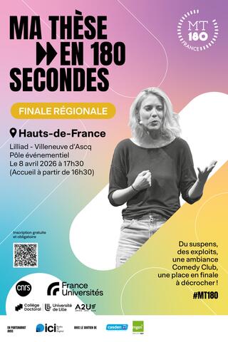 Hugo Perrette, doctorant de Marie-Laurence Haack est finaliste à l'édition 2026. La finale régionale Hauts-de-France "Ma thèse en 180 secondes" 2026, organisée par le CNRS, le Collège Doctoral de l'Université de Lille, l'Université de Lille et le Collège Doctoral A2U, aura lieu le 8 avril à partir de 17h30 à Lilliad Learning center Innovation de Villeneuve d'Ascq. Le défi des doctorants sélectionnés est de présenter au grand public leur travaux de recherche en 3 minutes.