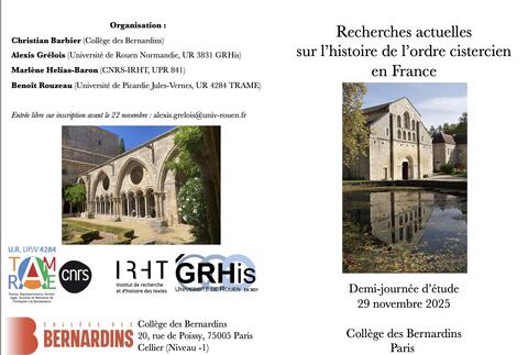Organisée par Ch. Barbier (Collège des Bernardins), A. Gelois (Univ. de Rouen Normandie, UR 3831 GRHis), M. Hélias-Baron (CNRS-IRHT, UPR 841) et B. Rouzeau (UPJV, UR 4284 TrAme)