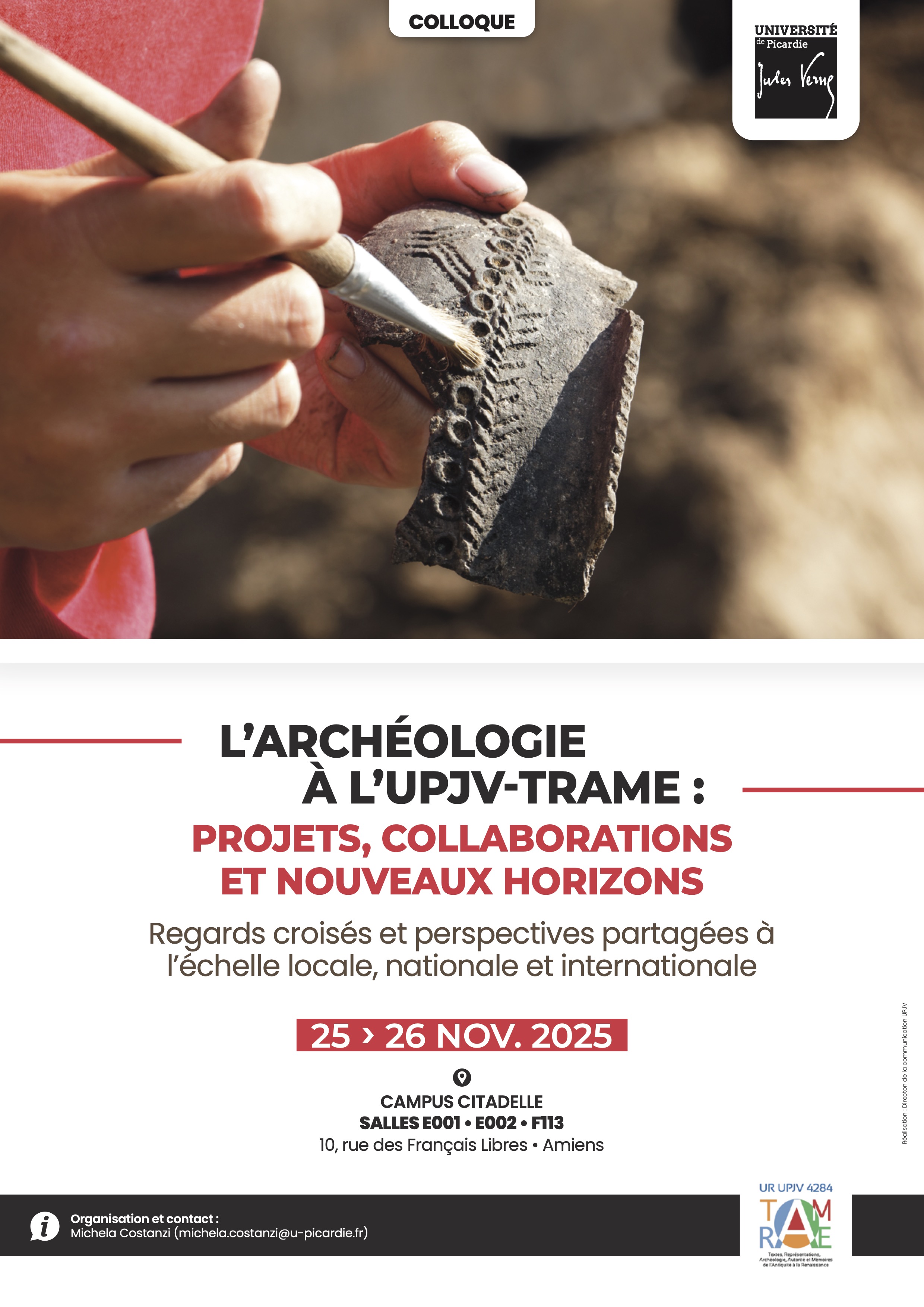 Le laboratoire TrAme organise les 25 et 26 novembre 2025 un colloque sur l’archéologie à l’UPJV-TrAme : projets, collaborations et nouveaux horizons. Regards croisés et perspectives partagées à l’échelle locale, nationale et internationale.